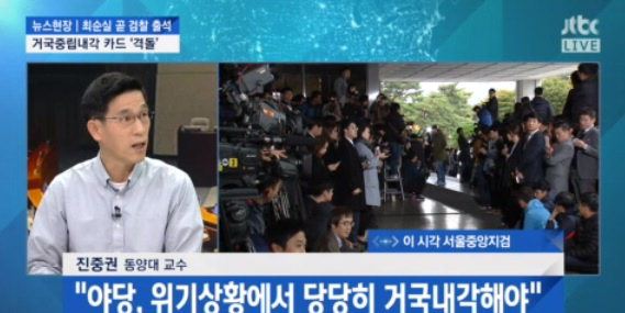 [아시아경제 한동우 인턴기자] 진중권 동양대 교수와 김진 중앙일보 논설위원이 거국중립내각을 야당이 거부하는 이유에 대해 설명했다.31일 방송된 JTBC 특집뉴스에서는 진중권 교수와 김진 위원이 패널로 출연해 거국중립내각의 이면에 대해 밝혔다.김 위원은 “거국중립내각은 절대 안 된다. 대통령중심제 특성상 거국내각은 나라에 혼란이 온다”고 말문을 열었다. 이어 김 위원은 “여당이 나라 혼란은 생각 않고 차기 대선 생각만 하는 것 같다. 야당도 이를 곰곰이 생각해보니 문제가 될 것 같아 거국내각을 거둬들이는 것이다”라며 여당이 거국내각을 주장하는 것은 대선을 염두에 두고 내린 판단이라고 주장했다.김 위원은 “그래서 책임총리로 가야 하고 김종인 전 더불어민주당 비상대책위원장이 적임자다. 대통령과 국정철학을 공유할 수 있어서다”라고 말했다.진중권 교수 역시 “거국내각은 계륵이다. 1년4개월 동안 뭐합니까. 여야 동수로 내각을 구성할 건데 권한은 거의 없고 책임질 일이 많을 것이다”고 말했다. 이어 “대통령은 원칙적으로 하야해야 한다. 국민들이 촛불집회를 하는 것은 수사를 제대로 하라는 뜻”이라고 주장했다.한동우 인턴기자 corydong@asiae.co.kr<ⓒ세계를 보는 창 경제를 보는 눈, 아시아경제(www.asiae.co.kr) 무단전재 배포금지>