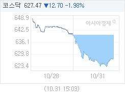 2016년 10월 31일 코스닥 지수는 15.49p (2.42%) 하락한 624.68로 마감했습니다.금일 (2시40분 기준) 코스닥 주요 상승 종목은 동일철강,세동,비엠티이며, 코스닥 주요 하락 종목은 에스아이티글로벌,GMR 머티리얼즈,인크로스입니다.아경봇 기자 r2@asiae.co.kr<ⓒ세계를 보는 창 경제를 보는 눈, 아시아경제(www.asiae.co.kr) 무단전재 배포금지>