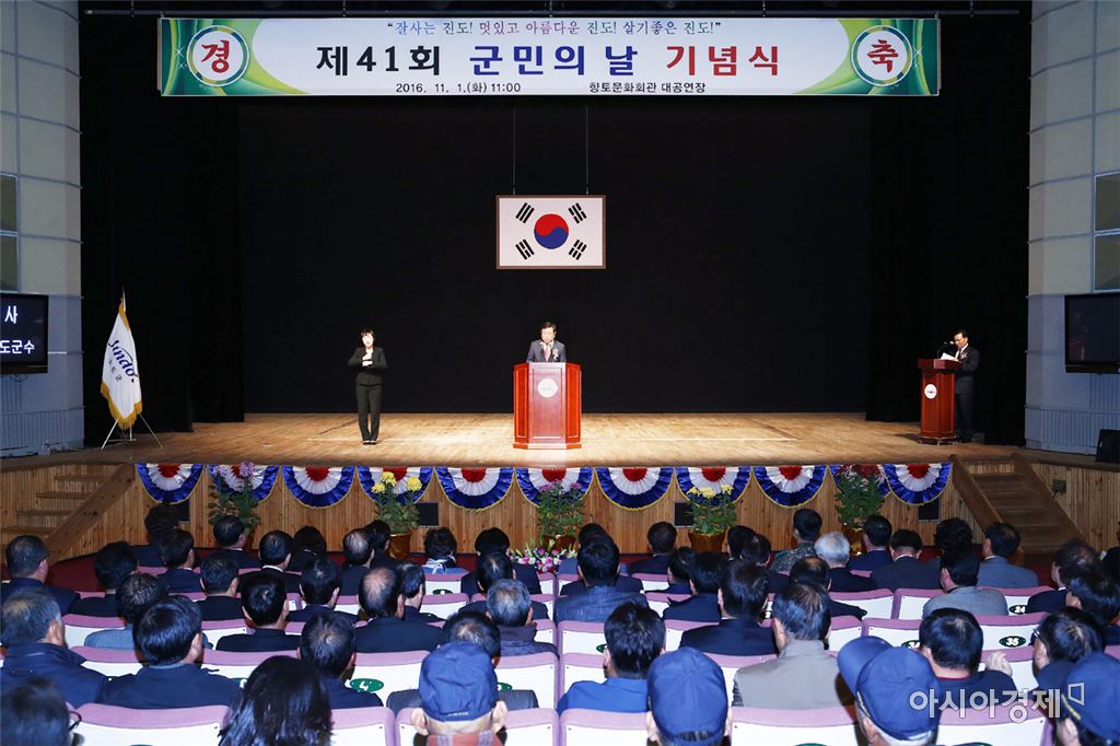 [아시아경제 노해섭 기자]제41회 진도군민의 날 행사가 지난 11월 1일 진도향토문화회관에서 열렸다.이날 행사는 이동진 진도군수, 김인정 군의회의장 등 관내 각급 기관단체장을 비롯해 향우, 주민 등 600여명이 참석한 가운데 성황리에 개최됐다. 기념행사는 1부 식전행사로 어르신 건강 체조 공연으로 첫무대를 장식해 참석자들에게 즐거움을 선사했다. 2부 기념식에서는 진도군민 헌장 낭독, 진도군민상 등 분야별 시상, 기념사와 축사, 군민의 노래 합창 등 다채로운 프로그램으로 진행됐다. 이동진 진도군수는 “잘사는 진도, 멋있는 아름다운 진도, 살기 좋은 진도 등 지역 발전의 결의를 새롭게 다지고자 군민의 날 행사를 개최했다”며 “진도군민의 단합된 힘으로 군민소득 1조원, 관광객 500만명 유치를 위해 노력해 나가자”고 말했다.노해섭 기자 nogary@ <ⓒ세계를 보는 창 경제를 보는 눈, 아시아경제(www.asiae.co.kr) 무단전재 배포금지>