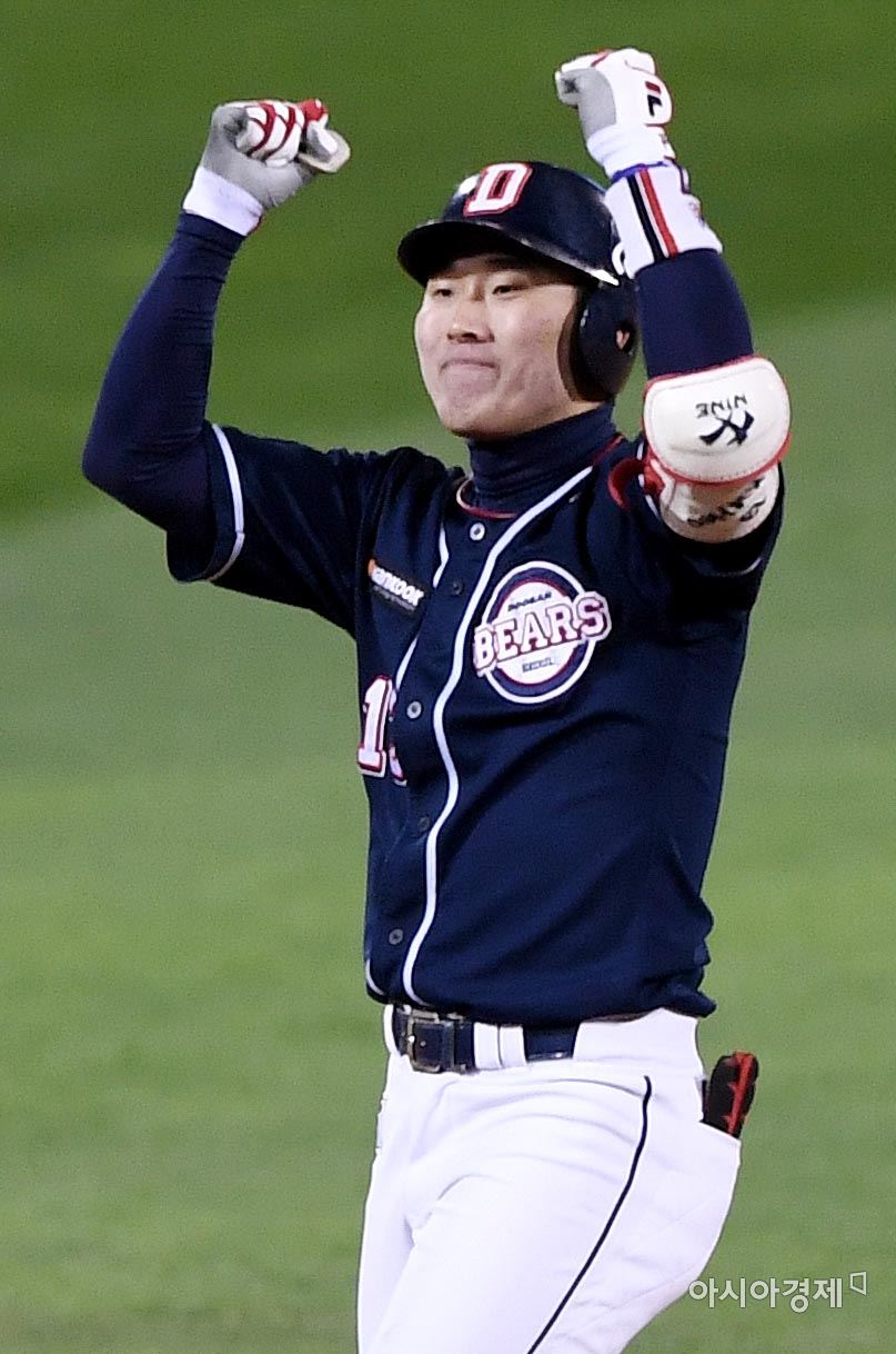 [창원=아시아경제 김현민 기자]프로야구 두산과 NC의 2016 KBO 포스트시즌 한국시리즈 3차전이 1일 마산구장에서 열렸다. 5회초 2사 2루에서 두산 허경민이 추가 1타점 2루타를 치고 기뻐하고 있다.김현민 기자 kimhyun81@asiae.co.kr<ⓒ세계를 보는 창 경제를 보는 눈, 아시아경제(www.asiae.co.kr) 무단전재 배포금지>