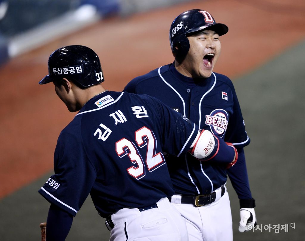 [창원=아시아경제 김현민 기자]프로야구 두산과 NC의 2016 KBO 포스트시즌 한국시리즈 3차전이 1일 마산구장에서 열렸다. 5회초 두산 선두타자 김재환이 NC 선발 최금강을 상대로 선제 솔로 홈런을 치고 오재일과 기뻐하고 있다.김현민 기자 kimhyun81@asiae.co.kr<ⓒ세계를 보는 창 경제를 보는 눈, 아시아경제(www.asiae.co.kr) 무단전재 배포금지>