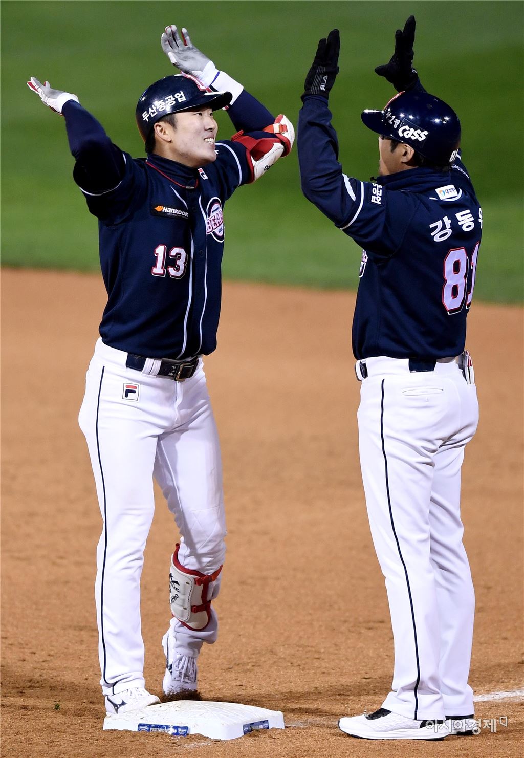 [창원=아시아경제 김현민 기자]프로야구 두산과 NC의 2016 KBO 포스트시즌 한국시리즈 3차전이 1일 마산구장에서 열렸다. 9회초 1사 만루에서 두산 허경민이 추가 2타점 적시타를 치고 강동우 코치와 환호하고 있다.김현민 기자 kimhyun81@asiae.co.kr<ⓒ세계를 보는 창 경제를 보는 눈, 아시아경제(www.asiae.co.kr) 무단전재 배포금지>