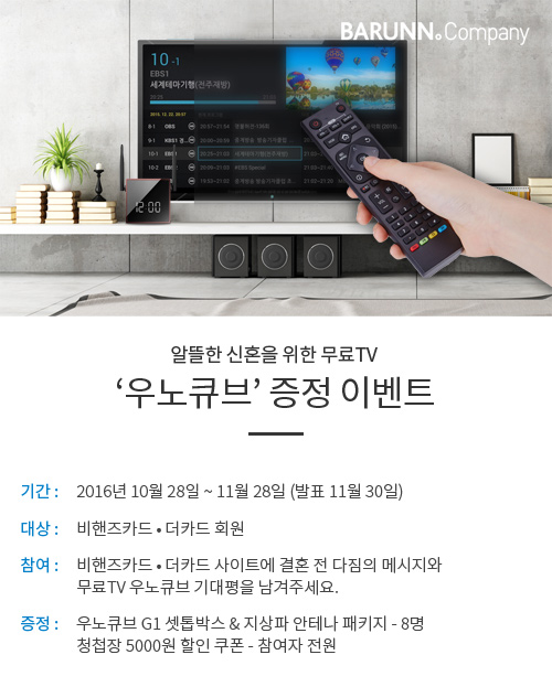 [아시아경제 임온유 기자] 청첩장 기업 바른컴퍼니는 알뜰한 신혼부부를 위해 TV 셋톱박스 '우노큐브' 증정 이벤트를 연다고 2일 밝혔다.바른컴퍼니는 그간 기업 제휴를 통해 결혼 전후 고객에게 다양한 혜택을 제공하는 ‘행복한 결혼 만들기 프로젝트’를 꾸준히 진행해 왔다. 그 일환으로 이번에는 비용 절감하는 알뜰한 신혼 생활을 돕기 위해 나섰다. 바른컴퍼니는 사물인터넷(IoT) 전문기업 알라딘그룹과 전략적 제휴를 맺고, 디지털 무료 TV 셋톱박스 ‘우노큐브’ 증정 이벤트를 실시한다. 오는 28일까지 바른컴퍼니 청첩장 브랜드 비핸즈카드·더카드의 웹사이트 이벤트 페이지에 응모 댓글을 남기면 추첨을 통해 8명에게 우노큐브 G1과 전용 안테나, 참여자 전원에게 청첩장 5000원 할인 쿠폰을 제공한다. 당첨자는 오는 30일 각 사이트 공지사항을 통해 발표한다. 알라딘그룹의 ‘우노큐브’는 TV튜너를 탑재한 미니 셋톱박스로 고화질의 지상파 TV 시청이 가능하다. 인터넷으로 제공되는 200개 이상의 TV 채널을 시청할 수 있다. 특히 가입비, 월 이용료 등 추가 비용이 전혀 없는 알뜰한 제품이다.바른컴퍼니는 온라인에서 실시하는 우노큐브 무료 증정 이벤트 외에도 매월 발행하는 바른웨딩북 10월호, 11월를 통해 우노큐브몰 20% 할인 쿠폰을 제공한다. 바른컴퍼니 관계자는 “신혼부부의 가계 운영 부담을 조금이라도 덜어주고자 이번 이벤트를 마련했다”며 “앞으로 꾸준한 기업 제휴를 통해 고객의 웨딩 준비부터 신혼 생활까지 도움을 주는 혜택을 더욱 늘려 나갈 것”이라고 말했다. 우노큐브 증정 이벤트에 대한 자세한 내용은 비핸즈카드, 더카드 사이트에서 확인할 수 있다. 임온유 기자 ioy@asiae.co.kr<ⓒ세계를 보는 창 경제를 보는 눈, 아시아경제(www.asiae.co.kr) 무단전재 배포금지>임온유 기자 ioy@asiae.co.kr<ⓒ아시아 대표 석간 '아시아경제' (www.newsva.co.kr) 무단전재 배포금지>