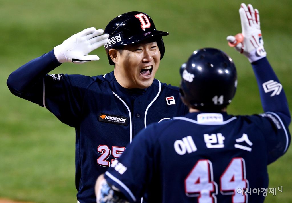 [창원=아시아경제 김현민 기자]프로야구 두산과 NC의 2016 KBO 포스트시즌 한국시리즈 4차전이 2일 마산구장에서 열렸다. 6회초 2사 2,3루에서 두산 허경민의 추가 2타점 2루타 때 득점한 2루주자 양의지가 선행주자 에반스와 환호하고 있다.김현민 기자 kimhyun81@asiae.co.kr<ⓒ세계를 보는 창 경제를 보는 눈, 아시아경제(www.asiae.co.kr) 무단전재 배포금지>