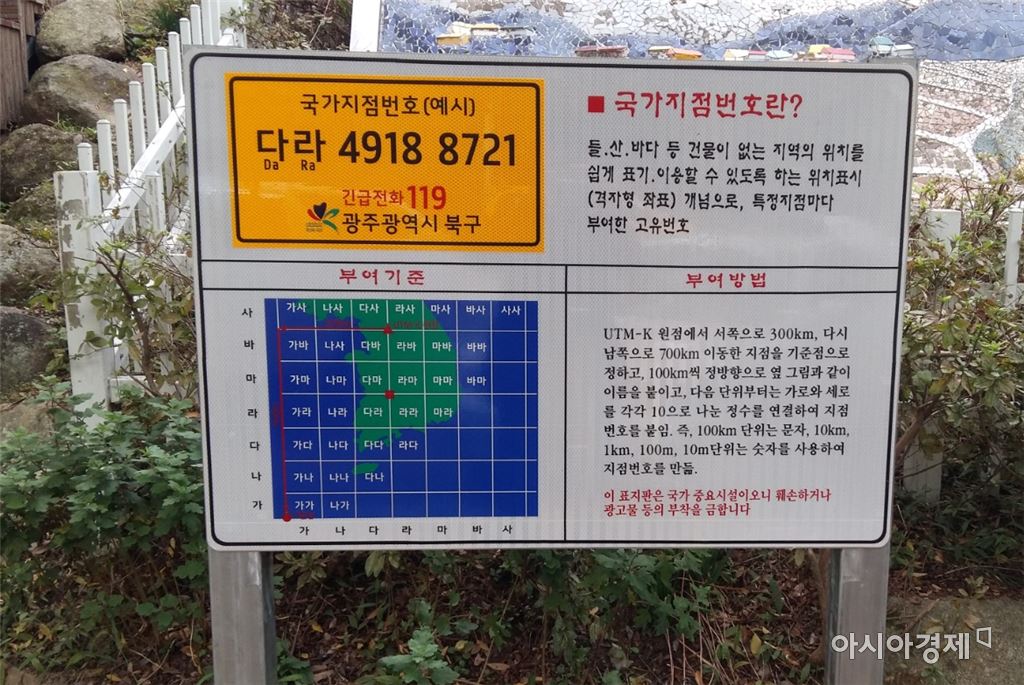 광주광역시 북구(청장 송광운)가 가을철 등산객 안전을 위해 운암산, 매곡산, 삼각산, 노고지리산 등 관내 등산로 4곳에 정확한 위치를 나타낼 수 있는 ‘국가지점번호판’ 21개를 설치했다.