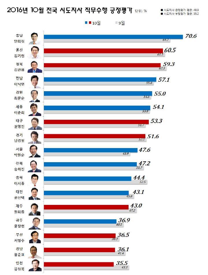 특히 안 지사는 6·4지방선거에서 자신이 얻은 득표율 52.2%에 비해 18.4%포인트 더 높은 지지율을 기록했다. 월간으로 진행되는 시도지사 지지율 조사에서도 연초 대비 가장 큰 상승폭을 보여줬다.김기현 시장은 60.5%를 기록해 전달에 비해 1%포인트 하락했으나 지난달 보다 한 단계 상승해 2위를 차지했다. 김관용 경북지사는 지난달에 비해 3%포인트 하락해 59.3%를 기록해 3위를 차지했다.반면 지지율이 가장 낮은 시도지사는 유정복 인천시장(35.5%), 홍준표 경남지사(36.1%), 서병수 부산시장(36.5%)으로 조사됐다.이번 여론조사는 유선 임의전화걸기(RDD), 자동응답 방식으로 10월28일부터 10월30일까지 3일간 전국 19세 이상 시도 주민 8500명(시도별 500명)을 실시했다. 시도별 표집오차는 95% 신뢰수준에서 ±3.1%포인트이며, 응답률은 4.1%이다.나주석 기자 gonggam@asiae.co.kr<ⓒ세계를 보는 창 경제를 보는 눈, 아시아경제(www.asiae.co.kr) 무단전재 배포금지>