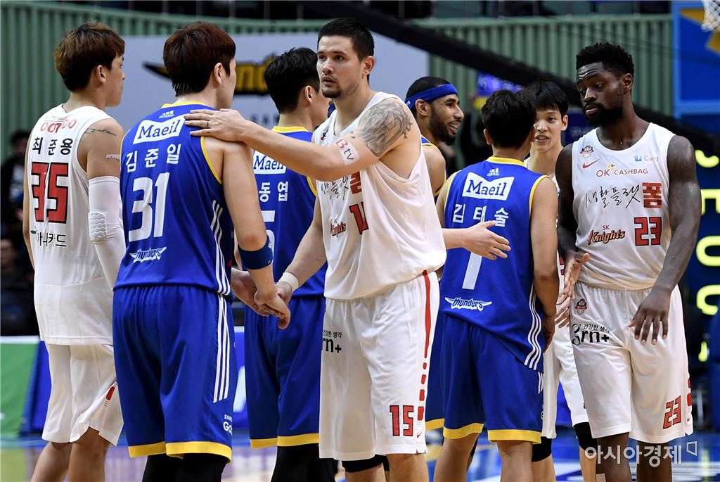 [아시아경제 김현민 기자]프로농구 서울 삼성과 서울 SK의 2016-2017 정규리그 경기가 6일 잠실실내체육관에서 열렸다. 88-84로 승리를 거둔 삼성 선수들이 SK 선수들과 인사를 나누고 있다. 김현민 기자 kimhyun81@asiae.co.kr<ⓒ세계를 보는 창 경제를 보는 눈, 아시아경제(www.asiae.co.kr) 무단전재 배포금지>