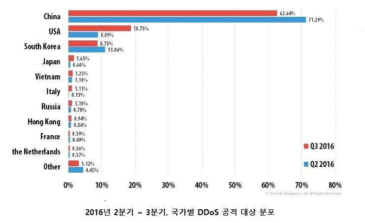 [아시아경제 이민우 기자] 카스퍼스키랩이 발표한 올 3분기 봇넷을 통한 디도스(DDoS·분산 서비스 거부 공격) 공격 실태에 대한 보고서를 발표했다고 7일 전했다. 보고서에 따르면 일본과 미국, 러시아에 대한 공격 횟수는 크게 증가했다. 반면 중국과 한국의 공격 피해는 눈에 띄게 감소했다. 중국에서 신고된 총 공격 횟수는 전보다 감소했지만 여전히 공격 표적 리소스의 비중이 가장 높은 국가는 중국이다. 주요 중국 검색 엔진을 대상으로 가장 많은 수의 공격(19회)이 발생했으며 중국의 한 공급업체는 최장기(184시간) 공격 대상이 됐다. 서부 유럽에 위치한 공격 서버의 활동이 늘어나면서 피해도 증가했다. 봇넷 디도스 공격이 가장 많이 발생한 주요 10개 국가에 이탈리아, 프랑스, 독일이 처음으로 포함됐다. 서부 유럽, 특히 영국과 프랑스, 네덜란드에서 활동하는 C&C 서버 증가와 관계가 있는 것으로 보인다. C&C 서버는 디도스 공격의 허브 역할을 하는 서버다. 또한 리눅스(Linux) 기반 디도스 봇에 의한 공격 비율이 꾸준히 늘어나 연중 최고치인 79%를 기록했다. 리눅스 기반 사물인터넷(IoT) 기기가 증가한 것이 원인으로 분석된다. 보이며, 카스퍼스키랩은 "미라이(Mirai) 공격툴의 소스 코드가 공개 이후로 이러한 경향이 더욱 두드러질 것"이라고 예상했다.전송 데이터의 암호화를 사용한 '지능적인' 공격도 증가할 것으로 내다봤다. 대표적인 예로 암호화된 연결을 통해 웹 사이트의 검색 양식과 같은 과부하 부분으로 비교적 적은 수의 쿼리를 전송하는 공격이 있다. 이러한 공격은 암호화된 트래픽에 숨겨져 있으며 트래픽 밀도가 낮아서 대다수의 전문 보호 솔루션조차 쉽게 감지하기 힘들다는 특징을 갖고 있다.한편 지난 8월 3일에 발생한 디도스 공격 건수는 지난 1년 간 최고치를 기록했다. 이 날에만 총 1746회의 봇넷을 통한 디도스 공격이 발생했다. 그 중 대부분이 미국에 위치한 한 서비스 공급업체의 서버를 대상으로 한 공격이었다.이창훈 카스퍼스키랩코리아 지사장은 "기존 증폭 디도스 공격의 차단이 늘어나자 암호화된 트래픽 활용 공격이 늘어나고 잇다"며 "디도스 공격 방지를 위한 적절한 보안 솔루션을 구비하는 등 추가 보호 조치가 필요하다"고 말했다.이민우 기자 letzwin@asiae.co.kr<ⓒ세계를 보는 창 경제를 보는 눈, 아시아경제(www.asiae.co.kr) 무단전재 배포금지>