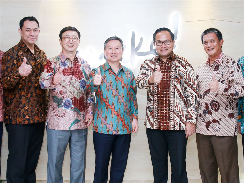 서준희 BC카드 사장(사진 왼쪽에서 두번째)이 8일 인도네시아 자카르타 메가 꾸닝안에 위치한 합작법인 사옥에서 열린 개소식에 참석해 허진영 MTI 합작법인 대표(왼쪽에서 세번째), 까르띠까 위르요앗모조 만디리 은행장(왼쪽에서 네번째)와 함께 기념사진 촬영을 하고 있다. (사진제공=BC카드)