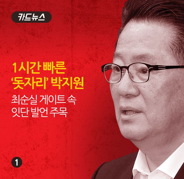1.1시간 빠른 '돗자리' 박지원최순실 게이트 속 잇단 발언 주목2.잇단 예견 적중"朴대통령, 특검 수용하고 '사교 아니다'할 것""김병준 국무총리 내정자와 관련해선 거론하지 않을 것"(4일 박근혜 대통령 대국민 담화 1시간 전)3.청와대 발표 전 대통령 행보 공개(8일 청와대 발표 1시간 전 페이스북)"국회의장실 통보에 의하면 대통령께서 오늘 오전 10시30분 의장실로 오셔서 의장님을 방문하신다고 한다. 나는 안 간다"4.국모총리 지명 철회까지…8일 "국무총리 내정자의 지명은 철회되는 것 같다"(朴, 국회의장 방문 1시간 전 국회에서 열린 비상대책위원-국회의원 연석회의)<ⓒ세계를 보는 창 경제를 보는 눈, 아시아경제(www.asiae.co.kr) 무단전재 배포금지>이광호 기자 kwang@asiae.co.kr<ⓒ아시아 대표 석간 '아시아경제' (www.newsva.co.kr) 무단전재 배포금지>