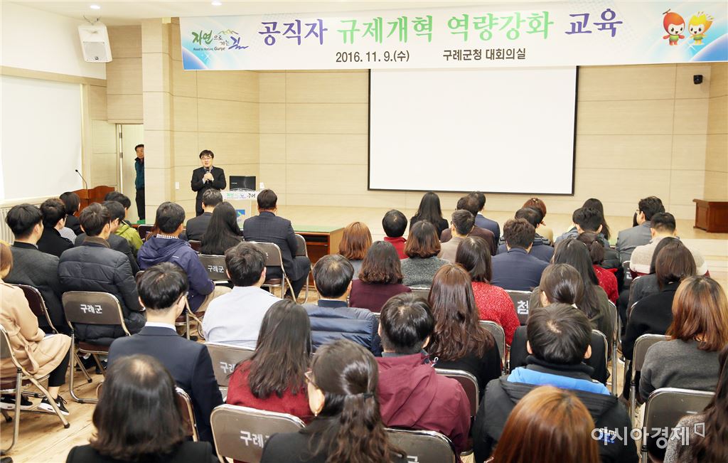 [아시아경제 이진택 기자]전남 구례군(군수 서기동)은 9일 군청 대회의실에서 120여 명의 대민접점 공무원을 대상으로 ‘공직자 규제개혁 역량 강화’교육을 실시했다. 이날 강의는 한국규제학회 연구위원장이며 규제개혁 분야에 전문가인 이민창 교수(조선대학교)를 초빙하여 “지역경제 활성화를 위한 지방자치와 정부규제의 조화”라는 주제로 교육을 진행했다. 이번 교육에서는 규제개혁 현황과 문제점, 공무원의 서비스 마인드 제고 및 대민접점 공무원의 역할과 중요성 등 공무원들이 적극적인 자세로 효과적인 규제개혁을 달성해야 지역경제를 부양할 수 있다는 점을 강조했다. 군 관계자는 “이번 교육을 통해 규제개혁에 대한 공무원의 공감대를 확대하고, 전 직원의 역량을 모아 주민 생활 불편 해소와 지역경제 활성화를 위해 불합리한 규제개선을 지속적으로 개선하여 군민이 체감할 수 있도록 최선을 다하겠다”고 말했다. 이진택 기자 <ⓒ세계를 보는 창 경제를 보는 눈, 아시아경제(www.asiae.co.kr) 무단전재 배포금지>