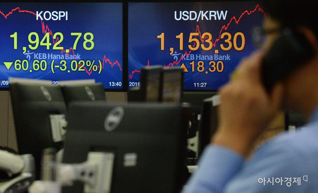 [아시아경제 문호남 인턴기자] 미국 대선 결과를 앞둔 9일 서울 중구 KEB하나은행 본점 딜링룸에서 딜러들이 외환업무를 보고 있다. 이날 코스피 지수는 힐러리 클린턴 민주당 후보의 당선 우세 예측으로 전 거래일보다 4.70p(0.23%) 오른 2,008.08p로 개장했지만 도널드 트럼프 공화당 후보의 당선 가능성이 높아지면서 코스피 지수가 급락하고 있다. 문호남 인턴기자 munonam@asiae.co.kr<ⓒ세계를 보는 창 경제를 보는 눈, 아시아경제(www.asiae.co.kr) 무단전재 배포금지>