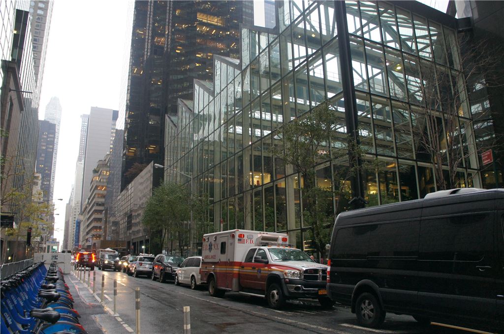 [아시아경제 뉴욕 황준호 특파원] 9일(현지시간) 미국 뉴욕 맨해튼 5번가 56번로에 위치한 트럼프타워에는 비가 오는 날씨에도 전날 미국 45대 대통령으로 당선된 트럼프를 보기 위한 인파와 함께 각종 시위대가 자리했다. 트럼프타워에는 트럼프의 집무실이 마련돼 있다. 이날 트럼프타워는 평소보다 더욱 삼엄한 경계를 하는 경호원들과 경찰들이 타워 입구를 막아섰다. 뉴욕 황준호 특파원 rephwang@asiae.co.kr<ⓒ세계를 보는 창 경제를 보는 눈, 아시아경제(www.asiae.co.kr) 무단전재 배포금지>