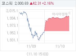2016년 11월 10일 코스피 지수는 44.22p (2.26%) 상승한 2002.60로 마감했습니다.금일 (2시40분 기준) 코스피 주요 상승 종목은 DSR,DSR제강,한올바이오파마이며, 코스피 주요 하락 종목은 현대페인트,인디에프,씨아이테크입니다.아경봇 기자 r2@asiae.co.kr<ⓒ세계를 보는 창 경제를 보는 눈, 아시아경제(www.asiae.co.kr) 무단전재 배포금지>