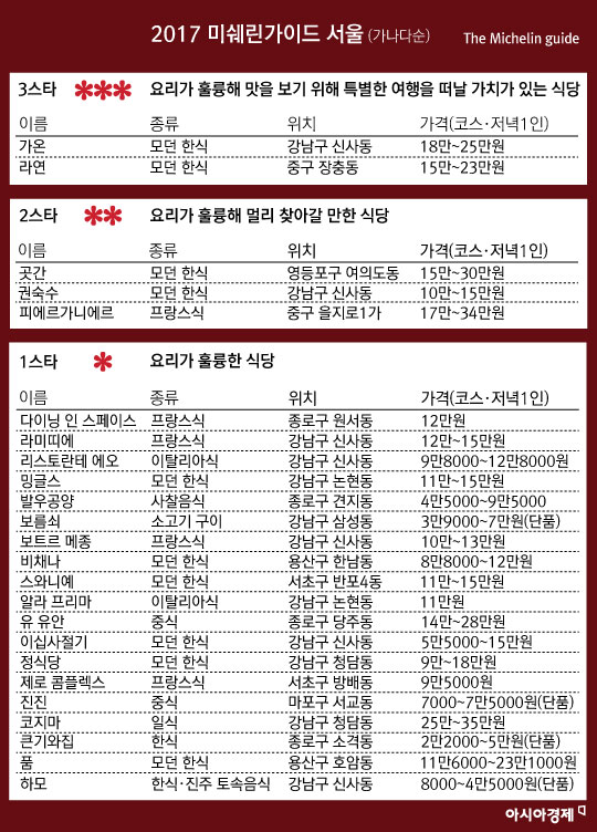 별 2개에는 한식 레스토랑 '곳간'과 '권숙수', 롯데 호텔의 프렌치 파인다이닝 레스토랑 '피에르 가니에르' 등 3곳이 선정됐다. 별 1개를 받은 식당은 사찰음식 전문점 '발우공양'을 비롯해 한식 레스토랑 '스와니예', 이탈리아식 레스토랑 '리스토란테 에오'와 '다이닝 인 스페이스' '정식당','비채나','라미띠에','큰기와집 ','진진','품','밍글스','보트르 메종','보름쇠','비채나','알 라 프리마','유유안','이십사절기','정식당','제로컴플렉스',' 큰기와집','하모' 등 19곳이다. 또 별은 없지만 필동면옥을 비롯한 36곳의 식당이 '빕 구르망(Bib Gourmand)'에 선정됐다. 빕 구르망은 별을 받을 만큼은 아니지만 가격대비 고객이 만족할 만한 수준의 음식을 제공하고 접근성이 좋은 곳들이 선정된다.사진=가온 홈페이지
