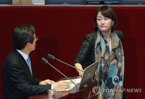 황교안 국무총리와 눈싸움 벌인 더민주 이재정 의원. 사진=연합뉴스 제공