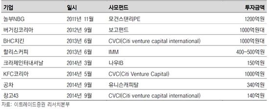 [아시아경제 김현정 기자] 외식업에 돈이 몰리고 있다. '돈이 될 만한' 투자처를 향해 발빠르게 움직이는 사모펀드의 적극적인 참여가 눈에 띈다. 소비 부진, 장기 불황으로 성장이 멈춘 유통업계에서 거의 유일한 투자처로 각광받는 분위기다. 서울에서 가장 임대료가 비싼 것으로 꼽히는 오피스 빌딩에 대규모 식당가가 조성돼 있다는 점도 시사하는 바가 크다. 1위~3위인 그랑서울, SFC, 더케이트윈타워 등은 청진상점가 식객촌, SFC몰 등 식당가가 유명하다. 센트럴 시티는 100억원을 투자해서 호남선 버스터미널 옆의 식당가를 리뉴얼, 파미에스테이션을 열었다. 사모펀드들의 움직임도 달라지고 있다. 기존의 전통적인 대형산업 투자 위주에서 최근 수년간 외식산업에 투자를 늘리는 추세다. 지난 5년 새 사모펀드로 인수·합병(M&A) 된 외식업체만 8곳에 이른다. 지난 2011년 놀부를 인수한 모건스탠리PE에 이어 이듬해 VIG파트너스가 두산그룹의 버거킹을 인수하고 2013년에는 로하튼이 bhc, IMM PE가 할리스에프앤비 경영권을 사들였다. 2014년에는 유니슨캐피탈이 공차코리아, CVC캐피탈은 KFC코리아를 1000억원에 인수했다. 이외에도 카페베네, 매드포갈릭 등이 잇달아 매각됐다.한국맥도날드 등 일부 외식 브랜드는 난항을 겪고 있지만 외식브랜드는 여전히 많은 사모펀드들이 군침을 흘리는 매물이다. KFC와 한국피자헛까지 미국의 유명 패스트푸드 외식 브랜드나 할리스에프앤비, bhc, 놀부, 공차 등도 잠정 매물로 거론된다. 그러나 사모펀드의 외식업계 잠식에 대한 우려의 목소리도 높다. 업의 특성에 대한 이해가 떨어지고 '투자처'로만 인식한 탓에 제대로된 투자나 개발이 이뤄지지 않는다는 것. 특히 지속적인 투자가 필요한 서비스나 사후서비스 등에 있어서 문제가 발생하는 경우가 종종있다. 업계 관계자는 "사모펀드의 목표는 회사를 싸게 사서 단기간에 비싸게 파는 것"이라면서 "중장기적인 성장목표를 두고 투자하는 것은 어렵다"고 설명했다. 아울러 "일부 서비스 중단이나 인적 구조조정 수순을 밟은 경우가 많다"면서 "업계 입장에서는 사모펀드로 관련업체들이 매각되는 것을 긍정적으로만 보기 어렵다"고 강조했다. 또 다른 관계자는 "성공적인 경우도 있지만 매각 작업이 지연되는 경우 임직원들의 불안감도 커지기 마련"이라면서 "브랜드 이미지나 능률의 차원에서 부정적인 영향을 미치는 것은 맞다"고 말했다. 김현정 기자 alphag@asiae.co.kr<ⓒ세계를 보는 창 경제를 보는 눈, 아시아경제(www.asiae.co.kr) 무단전재 배포금지>