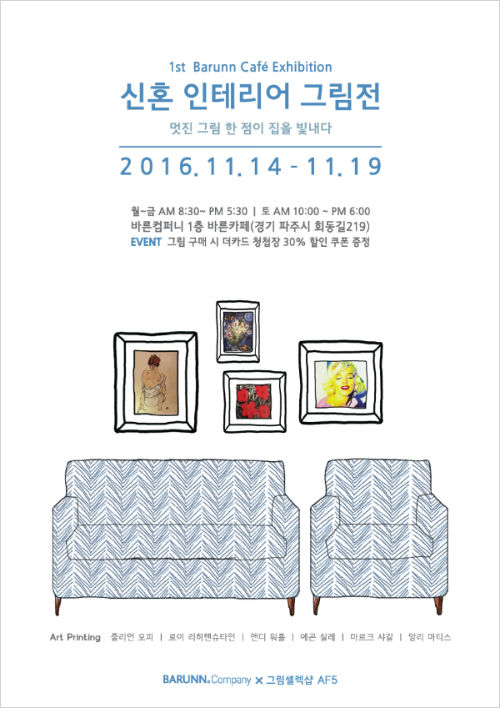 [아시아경제 임온유 기자] 청첩장 업체 바른컴퍼니가 14일부터 오는 19일까지 파주출판도시의 본사 1층 바른카페에서 '신혼 인테리어 그림전'을 개최한다. 그림셀렉샵 AF5와 함께 진행하는 이번 전시는 줄리언 오피, 로이 리히텐슈타인, 앤디 워홀, 에곤 실레 등 유명 작가의 아트 프린팅 액자와 유럽 일러스트화, 빈티지 포스터 등 신혼집 인테리어에 포인트로 활용하기 좋은 그림들로 구성됐다. 전시 개최를 기념해 그림 구매 고객을 대상으로 더카드 청첩장 할인 이벤트도 실시한다. 전시 기간 동안 현장에서 그림을 구입하면 바른컴퍼니 유니크 청첩장 브랜드 더카드의 30% 할인 쿠폰을 증정한다. 그림 가격대는 4만~30만원대이며 대부분 10만원대의 합리적인 가격에 구매 가능하다. 이벤트에 대한 자세한 내용은 더카드 사이트에서 확인할 수 있다. 바른컴퍼니 관계자는 “전망 좋은 카페에서 데이트를 겸해 전시회 구경도 하고, 청첩장 할인 혜택까지 누리는 문화이벤트를 즐겼으면 좋겠다”고 말했다. 한편 바른컴퍼니는 지난 8월10일 임직원 복지의 일환으로 사내 카페 ‘바른카페’를 열고, 전시회와 바자회 등 다양한 문화 이벤트를 개최하며 파주출판도시 문화 공간으로서의 역할을 넓혀가고 있다. 지난 10일 진행된 임직원 바자회 ‘바른나눔데이’도 약 200여 명의 임직원과 방문객이 참여해 성황리에 마무리됐다. 커피 및 물품 판매를 통한 바자회 수익금 전액은 파주시장애인종합복지관에 기부될 예정이다. 임온유 기자 ioy@asiae.co.kr<ⓒ세계를 보는 창 경제를 보는 눈, 아시아경제(www.asiae.co.kr) 무단전재 배포금지>임온유 기자 ioy@asiae.co.kr<ⓒ아시아 대표 석간 '아시아경제' (www.newsva.co.kr) 무단전재 배포금지>