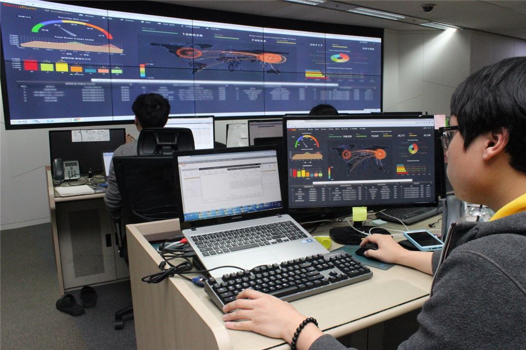 빅데이터 기반 보안플랫폼 '시큐디움(Secudium)'이 구축된 SK인포섹 통합보안관제센터(SOC) 근무 모습(사진=SK인포섹)