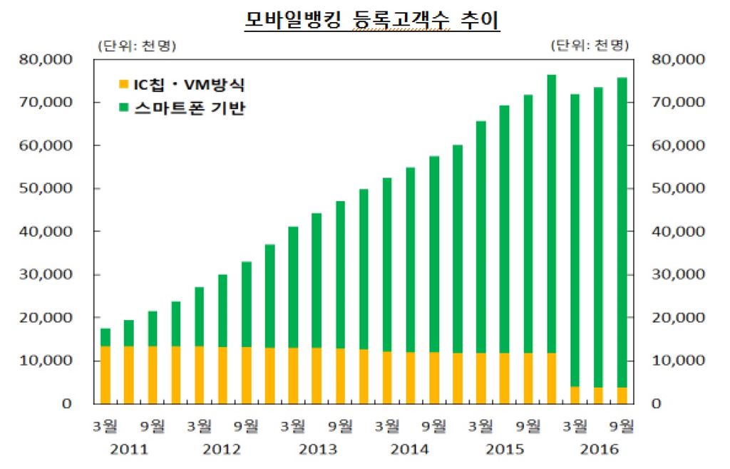 [아시아경제 정현진 기자] 은행 이용자들이 계좌를 조회할 때 10번 중 8번은 인터넷 뱅킹을 이용하는 것으로 나타났다.한국은행이 16일 발표한 '2016년 3분기 국내 인터넷뱅킹 서비스 이용 현황'에 따르면 지난 9월 중 전체 조회서비스에서 인터넷뱅킹 비중은 80.4%로 6월(78.3%)에 비해 2.1%포인트 올랐다.조회서비스를 이용하는 채널 가운데 인터넷뱅킹이 80%를 넘긴 것은 통계가 생긴 2005년 이후 처음이다. 계좌를 조회를 할 때 10건 중 8건은 인터넷뱅킹을 이용한다는 의미다. 반면 창구와 자동화기기(CD/ATM) 등 오프라인으로 계좌를 조회하는 비중은 15.6%에 그쳤다.입출금 및 자금이체에서 인터넷뱅킹 비중도 지난 9월 42.7%로 사상 최고치를 기록했다.모바일을 포함한 인터넷뱅킹 사용은 꾸준히 늘고 있다. 3분기(7~9월) 중 PC, 스마트폰 등에 기반한 인터넷뱅킹의 하루 평균 이용건수는 8790만건으로 1.9% 늘었다. 인터넷뱅킹을 통한 대출신청 금액도 하루 평균 432억원으로 2분기보다 5.4% 늘었다.지난 9월 말 현재 인터넷뱅킹서비스 등록고객은 1억2072만명으로 6월 말보다 1.4% 늘었다.다만 이용금액은 자금이체 이용금액이 소폭 줄면서 41조6560억원으로 1.7% 감소했다.스마트폰 보급이 확대되면서 모바일 뱅킹 서비스를 이용하는 고객도 늘고 있다. 전체 모바일뱅킹 이용건수는 하루 평균 5392만6000건으로 전분기보다 2.0% 늘었고 이용금액도 3조2084억원으로 4.2% 증가했다.특히 스마트폰뱅킹 이용건수는 3분기 중 하루 평균 5379만7000건으로 집계돼 1년 새 27.1%나 급증했다. 스마트폰뱅킹 이용금액도 3분기 중 하루 평균 3조1797억원으로 2분기에 비해 4.3% 늘었다. 스마트폰뱅킹 등록고객은 7203만명(9월 말 기준)으로 6월에 비해 226만명 늘었다.전체 인터넷뱅킹에서 모바일뱅킹이 차지하는 비중은 이용건수 기준으로 61.4%, 이용금액 기준으로 7.7%로 나타났다.정현진 기자 jhj48@asiae.co.kr<ⓒ세계를 보는 창 경제를 보는 눈, 아시아경제(www.asiae.co.kr) 무단전재 배포금지>