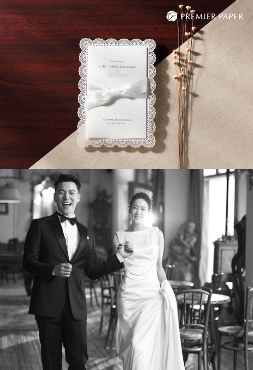 [아시아경제 임온유 기자] 드라마 '태양의 후예'에 출연한 배우 조태관의 청첩장이 공개됐다.청첩장 업체 바른컴퍼니는 17일 보도자료를 통해 오는 19일 결혼하는 조태관의 청첩장을 선보였다. 조태관이 선택한 청첩장은 고급 청첩장 브랜드 프리미어페이퍼의 'BH4012'이다. 테두리를 아기자기한 레이저 펀칭 레이스로 감싸고 중앙에 실크 리본을 덧대 고급스러움을 살렸다. 마치 순백의 웨딩드레스를 입은 신부를 연상시키는 우아하고 로맨틱한 청첩장이다. 끼움 형태로 제작된 내지는 도톰한 고급 용지를 사용했으며, 청첩장 봉투 안 쪽에 실크 종이를 덧대 속이 비치지 않도록 하는 등 세심한 마무리가 돋보인다. 프리미어페이퍼 관계자는 "신랑 신부가 늦가을 예식에 어울리는 차분하면서도 로맨틱한 화이트 레이스 청첩장을 마음에 들어 했다"고 말했다. 임온유 기자 ioy@asiae.co.kr<ⓒ세계를 보는 창 경제를 보는 눈, 아시아경제(www.asiae.co.kr) 무단전재 배포금지>임온유 기자 ioy@asiae.co.kr<ⓒ아시아 대표 석간 '아시아경제' (www.newsva.co.kr) 무단전재 배포금지>