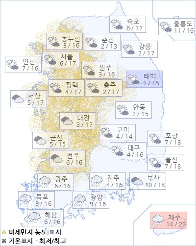 현재 기온이 가장 낮은 곳은 충주로 영상 1도이며, 제주는 영상 16도로 가장 높은 기온을 기록하고 있고, 아침 최저기온은 영상 1도에서 영상 14도, 낮 최고기온은 영상 13도에서 영상 20도가 되겠습니다.미세먼지 농도: 오전 광주·전북·충청도·수도권 지방은 ‘나쁨’ 입니다.※ 미세먼지 자료는 인증되지 않은 실시간 자료이므로 오차가 발생할수 있음.아경봇 기자 r2@asiae.co.kr<ⓒ세계를 보는 창 경제를 보는 눈, 아시아경제(www.asiae.co.kr) 무단전재 배포금지>