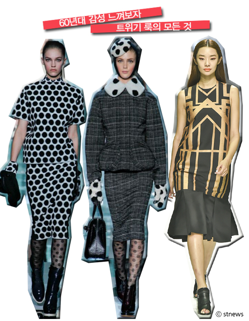 2016년 봄/여름 앤디앤뎁 컬렉션에서는 미니멀한 실루엣 블랙 컬러 원피스에 골드 컬러 라인이 더해진 복고 스타일을 선보였다. 너풀거리는 스커트를 레이어드해 현대적인 감각을 더했다. 군더더기 없는 미니멀한 실루엣 원피스는 트위기룩 대표적인 아이템이기도 하다.2014년 가을/겨울 모스키노 컬렉션에서는 레드&옐로우 컬러가 믹스된 룩을 선보였다. 위트있고 화려한 컬러 가득한 원피스지만 디테일과 실루엣이 60년대 트위기룩을 연상시키는 패션이다. 복고 느낌 담은 레드 컬러 포인트가 인상적이다.◆ 도트 패턴이 빠질 수 없지2011년 가을/겨울 마크제이콥스 컬렉션