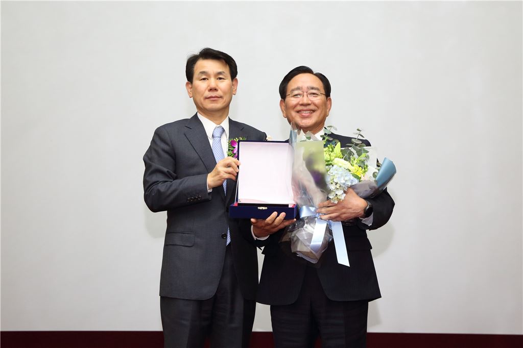 18일 여의도 한국거래소에서 열린 '2016 ESG 우수기업' 시상식에서 신한금융그룹이 상장사 최초로 2년 연속 'ESG 우수기업' 대상을 수상했다. (오른쪽부터) 한동우 신한금융그룹 회장과 정은보 금융위원회 부위원장이 기념 촬영을 하고 있다. (사진 : 신한금융그룹)