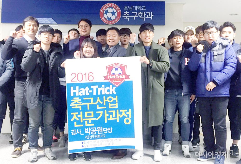 [아시아경제 노해섭 기자]호남대학교 해트트릭사업단(단장 장재훈)은 11월 16일 안산무궁화FC 박공원 단장을 초청해 특강을 실시했다. 이날 특강은 ‘K리그 프로구단운영의 방향’이라는 주제로 2시간여 동안 현 프로구단이 안고 있는 문제점과 해결방안에 대해 강의와 질의응답 시간 등으로 진행됐다. 현재 안산무궁화FC 박공원 단장은 오는 2017년 기존 안산무궁화FC에서 시민구단으로 새롭게 창단되는 안산시민프로축구단장이라는 막중한 책임을 지고 있다.노해섭 기자 nogary@<ⓒ세계를 보는 창 경제를 보는 눈, 아시아경제(www.asiae.co.kr) 무단전재 배포금지>