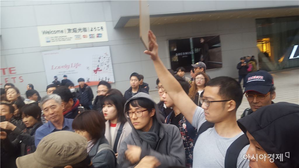 [아시아경제 정동훈 기자]박근혜를 사랑하는 사람들의 모임(박사모) 등 보수단체의 집회가 열린 19일 오후 서울역 인근에서 박근혜 퇴진을 요구하는 1인 시위자와 보수집회 참여자들의 충돌이 발생했다. 몸싸움을 저지하던 한 경찰은 보수집회 참여자가 휘두른 태극기에 뒤통수를 맞기도 했다.이날 오후 4시20분께 서울역 하이마트 앞에서 김병수 씨가 '박근혜는 청와대에서 나가라'는 구호가 적힌 피켓을 들고 1인 시위를 시작했다. 김씨는 "박사모 집회에서 계엄령 얘기가 나오더라 말이 안된다고 생각한다"며 "피켓에 적혀져 있는대로 하고 싶은 말을 하고 싶어서 나왔다"고 밝혔다.김씨의 시위가 시작되자 보수집회 참여자들이 몰려와 고성과 몸싸움이 시작됐다. 보수집회 참여자 30~40명은 1인 시위자를 에워싸고 "광화문으로 가라", "빨갱이 **들", "김정은이 그렇게 좋냐?", "전라도지?" 등의 발언을 쏟아냈다. 일부 시민들은 1인 시위자를 보호하기 위해 몰려들었고 한때 몇몇 시위자들이 넘어지는 등 몸싸움이 격렬해졌다.경찰이 보수집회 참가자에게 태극기로 뒤통수를 맞는 모습이다. 사진=동영상 화면 캡처.