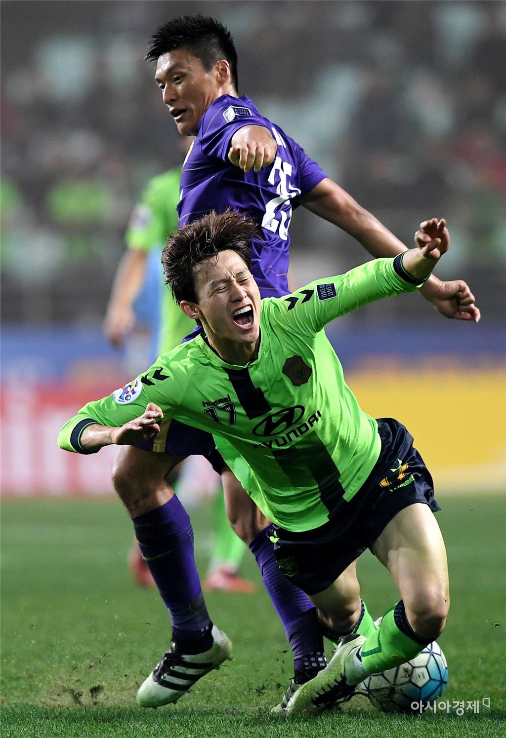 [전주=아시아경제 김현민 기자]프로축구 전북 현대와 알 아인(아랍에미리트)의 2016 아시아축구연맹 챔피언스리그(ACL) 결승 1차전이 19일 전주월드컵경기장에서 열렸다. 전북 이재성이 알 아인 이명주의 거친 태클에 넘어지고 있다. 김현민 기자 kimhyun81@asiae.co.kr<ⓒ세계를 보는 창 경제를 보는 눈, 아시아경제(www.asiae.co.kr) 무단전재 배포금지>