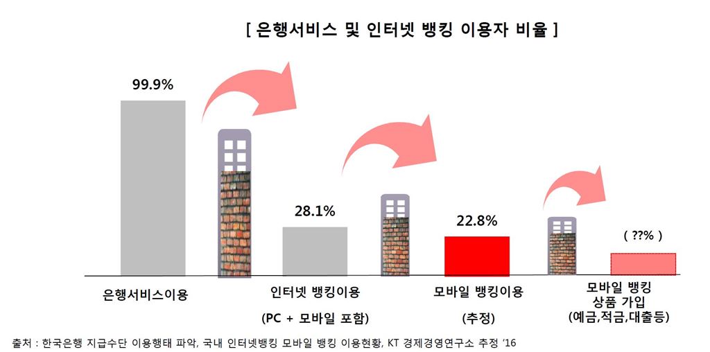 높은 스마트폰 보급률에 비해 모바일 뱅킹이 63%에 불과한 것은 스마트폰 해킹, 분실 등의 잠재 위험성에 대해 소비자의 불안감이 존재하기 때문으로 분석된다.KT경제경영연구소가 조사한 바에 따르면 모바일뱅킹을 이용하지 않는 가장 큰 이유는 스마트폰 해킹 위험 때문(41.8%)인 것으로 나타났다.뒤를 이어 '기존 서비스에 대한 불편함이 없음'(22.7%), '작은 화면이 불편해서'(13.6%), '스마트폰 분실 위험'(12.7%), '실제 돈이 아닌 화면상 거래 같아서'(3.3%)의 순이었다.모바일 뱅킹 이용률을 높이기 위해서 서비스 제공자들은 해킹/분실에 대하 대책 마련, 모바일뱅킹 혜택강화, UI(사용자 환경)/UX(사용자 경험) 개선을 통해 작은 화면의 불편함을 해소해야 하는 것으로 지적됐다.