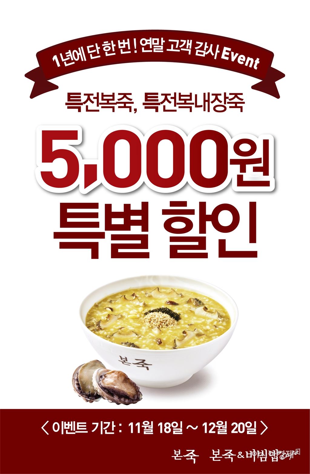 [아시아경제 오주연 기자] 본아이에프에서 운영하는 죽 전문점 본죽이 다가오는 연말을 맞아 보양죽 메뉴인 '특전복죽'과 '특전복내장죽'을 5000원 할인 판매하는 고객 감사 이벤트를 진행한다. 다음달 20일까지 진행되는 이번 이벤트는 기존 2만원의 특전복죽과 2만2000원의 특전복내장죽을 5000원 할인해 각각 1만5000원과 1만7000원에 판매한다. 전국 본죽 매장과 본죽·비빔밥카페 매장에서 함께 진행되며 포장시에도 동일하게 할인 받을 수 있다. 특전복죽은 일반 전복죽보다 전복의 양이 3배 많이 들어가는 보양식 메뉴로 전복의 쫄깃쫄깃한 식감이 일품이다. 또한 지난 8일 선보인 특전복내장죽은 기존 전복죽에 초록색을 띄는 전복 내장을 함께 넣어 전복의 쫄깃함과 내장의 고소함을 동시에 느낄 수 있는 메뉴다. 특히 두 메뉴의 주재료인 전복은 칼륨, 칼슘, 인 등의 무기질과 비타민이 풍부해 바다의 산삼이라 불리며, 면역력이 약해진 겨울철 원기회복에 도움을 준다.오주연 기자 moon170@asiae.co.kr<ⓒ세계를 보는 창 경제를 보는 눈, 아시아경제(www.asiae.co.kr) 무단전재 배포금지>