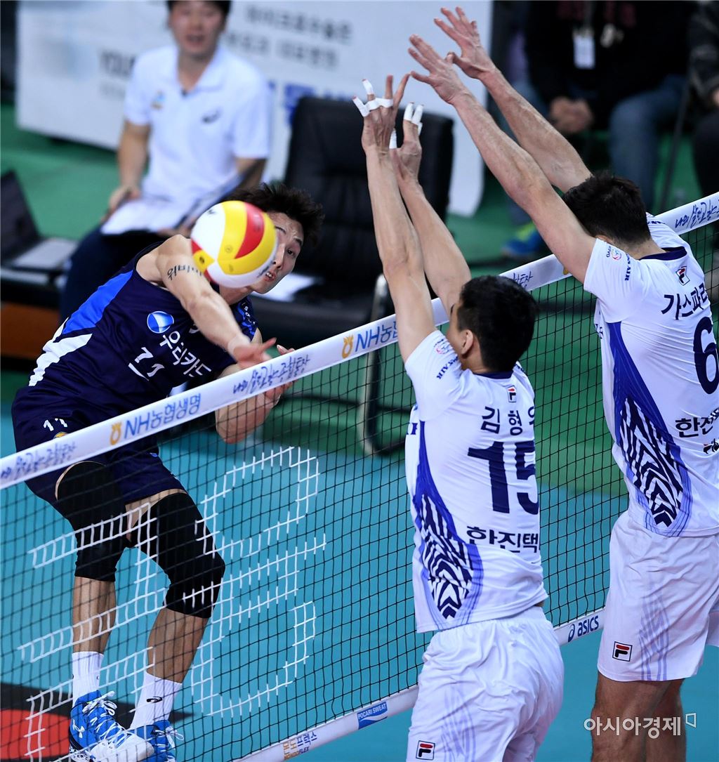 [아시아경제 김현민 기자]프로배구 우리카드와 대한항공의 2016-2017 정규리그 경기가 24일 서울 장충체육관에서 열렸다. 우리카드 최홍석이 상대 김형우의 블로킹에 막히고 있다. 김현민 기자 kimhyun81@asiae.co.kr<ⓒ세계를 보는 창 경제를 보는 눈, 아시아경제(www.asiae.co.kr) 무단전재 배포금지>김현민 기자 kimhyun81@asiae.co.kr<ⓒ아시아 대표 석간 '아시아경제' (www.newsva.co.kr) 무단전재 배포금지>