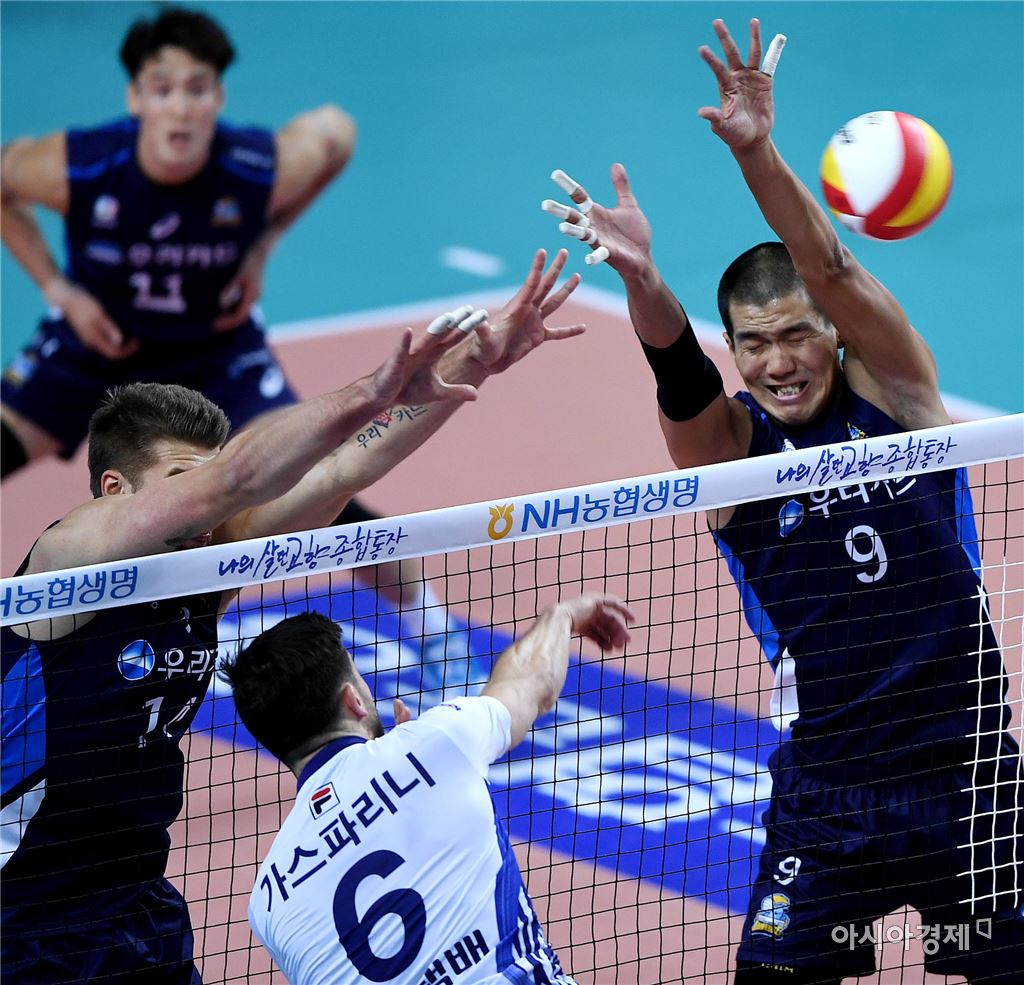 [아시아경제 김현민 기자]프로배구 우리카드와 대한항공의 2016-2017 정규리그 경기가 24일 서울 장충체육관에서 열렸다. 우리카드 김은섭이 상대 가스파리니의 스파이크를 블로킹으로 막아서고 있다. 김현민 기자 kimhyun81@asiae.co.kr<ⓒ세계를 보는 창 경제를 보는 눈, 아시아경제(www.asiae.co.kr) 무단전재 배포금지>김현민 기자 kimhyun81@asiae.co.kr<ⓒ아시아 대표 석간 '아시아경제' (www.newsva.co.kr) 무단전재 배포금지>