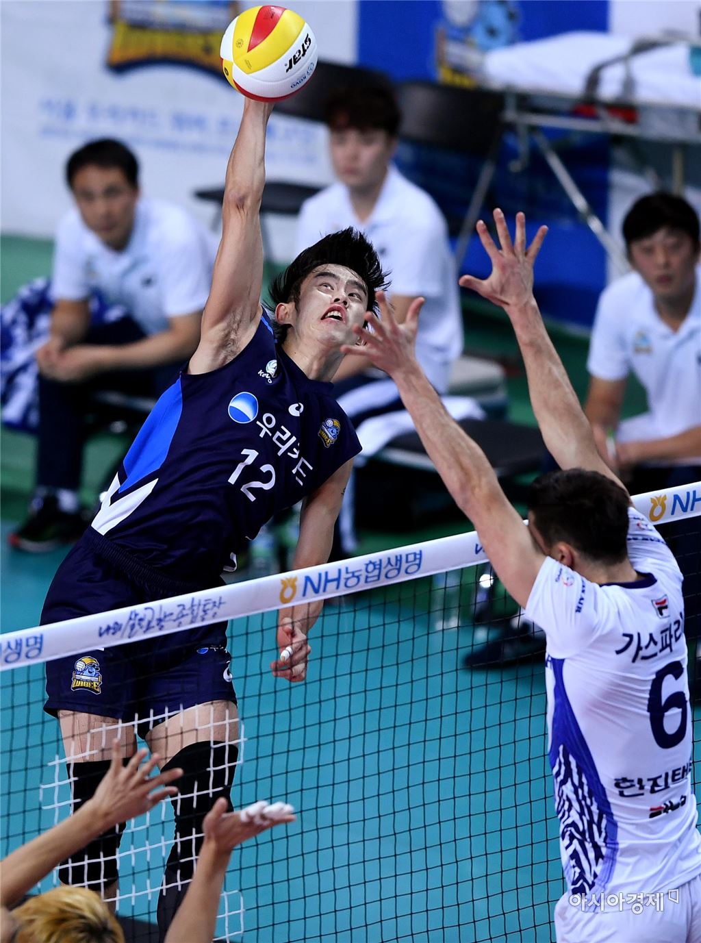 [아시아경제 김현민 기자]프로배구 우리카드와 대한항공의 2016-2017 정규리그 경기가 24일 서울 장충체육관에서 열렸다. 우리카드 신으뜸이 상대 블로킹을 뚫고 공격하고 있다. 김현민 기자 kimhyun81@asiae.co.kr<ⓒ세계를 보는 창 경제를 보는 눈, 아시아경제(www.asiae.co.kr) 무단전재 배포금지>김현민 기자 kimhyun81@asiae.co.kr<ⓒ아시아 대표 석간 '아시아경제' (www.newsva.co.kr) 무단전재 배포금지>