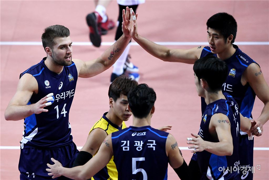 [아시아경제 김현민 기자]프로배구 우리카드와 대한항공의 2016-2017 정규리그 경기가 24일 서울 장충체육관에서 열렸다. 우리카드 파다르가 득점한 뒤 동료들과 기뻐하고 있다. 김현민 기자 kimhyun81@asiae.co.kr<ⓒ세계를 보는 창 경제를 보는 눈, 아시아경제(www.asiae.co.kr) 무단전재 배포금지>김현민 기자 kimhyun81@asiae.co.kr<ⓒ아시아 대표 석간 '아시아경제' (www.newsva.co.kr) 무단전재 배포금지>