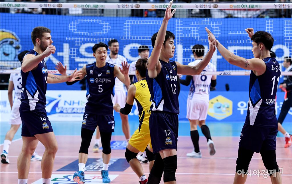 [아시아경제 김현민 기자]프로배구 우리카드와 대한항공의 2016-2017 정규리그 경기가 24일 서울 장충체육관에서 열렸다. 우리카드 선수들이 세트스코어 3-1로 승리한 뒤 기뻐하고 있다. 김현민 기자 kimhyun81@asiae.co.kr<ⓒ세계를 보는 창 경제를 보는 눈, 아시아경제(www.asiae.co.kr) 무단전재 배포금지>김현민 기자 kimhyun81@asiae.co.kr<ⓒ아시아 대표 석간 '아시아경제' (www.newsva.co.kr) 무단전재 배포금지>
