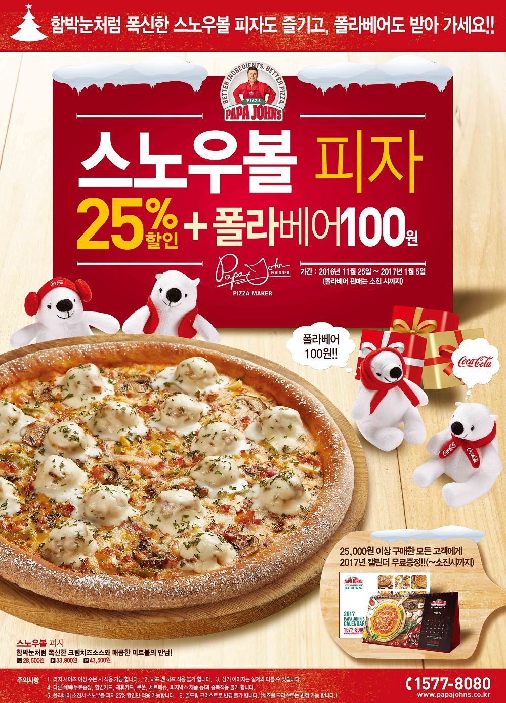 [아시아경제 오주연 기자]한국파파존스가 크림 앤 치즈 소스와 미트볼 토핑을 풍성하게 담아낸 겨울 신메뉴 ‘스노우볼 피자’를 출시했다고 25일 밝혔다. 스노우볼 피자는 매콤한 미트볼 위에 진하고 고소한 크림 앤 치즈 소스가 듬뿍 올라가 함박눈을 연상케 하는 파파존스의 겨울 신메뉴로, 도우 위에는 슈가 파우더로 마무리한 것이 특징이다. 파파존스는 신메뉴 출시를 기념해 내년 1월5일까지 25% 할인된 가격에 판매하며, 신메뉴 구입 시 ‘코카콜라 폴라베어’ 인형을 100원에 구매할 수 있는 혜택도 제공한다. 한정 수량 판매인 코카콜라 폴라베어는 총 4종류로 재구매를 통해 다양한 인형을 만나실 수 있다.또한 파파존스 메뉴를 2만5000원 이상 구매하는 모든 고객에게 ‘2017년 파파존스 캘린더’를 증정한다. 선착순으로 증정하는 이번 캘린더는 다양한 할인혜택이 가득 담겨 있는 쿠폰페이지가 수록되어 있으며, 캘린더 증정 이벤트는 재고 소진 시 까지 진행될 예정이다.오주연 기자 moon170@asiae.co.kr<ⓒ세계를 보는 창 경제를 보는 눈, 아시아경제(www.asiae.co.kr) 무단전재 배포금지>