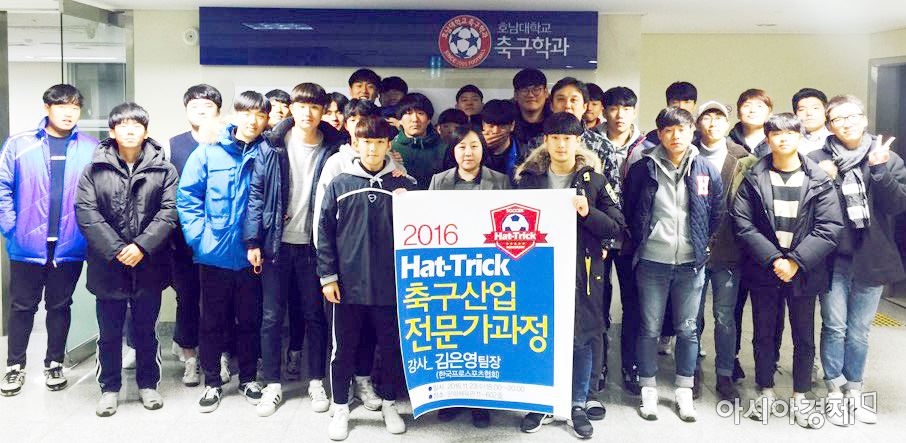 [아시아경제 노해섭 기자]호남대학교 해트트릭 사업단(단장 장재훈)은 지난 23일 한국프로스포츠 김은영 팀장을 초청해 축구산업전문가과정을 실시했다. 이날 축구산업전문가과정은 ‘한국프로스포츠의 현재’라는 주제로 2시간여 동안 한국의 프로스포츠구단의 마케팅, 행정 및 운영에 대하여 강의와 질의응답 시간 등으로 진행됐다. 김은영 팀장은 “개개인의 능력에 있어서 여러 가지 다양한 일들을 할 수 있어야 하고 홈경기를 축제화 시키는 것이 중요하다”고 강조했다노해섭 기자 nogary@<ⓒ세계를 보는 창 경제를 보는 눈, 아시아경제(www.asiae.co.kr) 무단전재 배포금지>