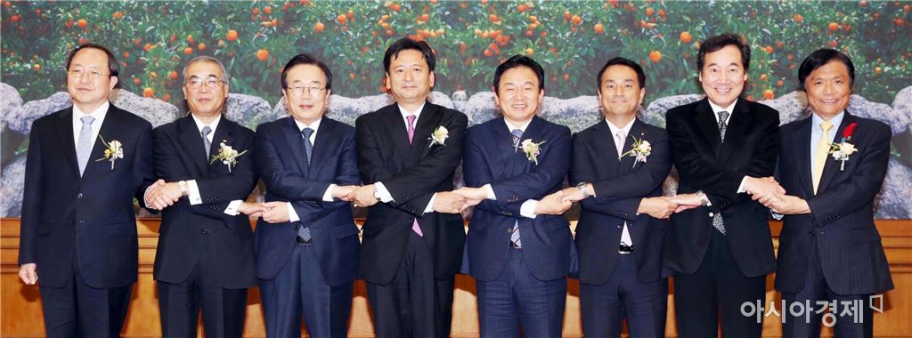 [아시아경제 노해섭 기자]‘제25회 한일해협연안 시도현교류 지사회의’가 25일 오후 제주도 서귀포시 롯데호텔에서 열린 가운데 양측 지사들이 회담을 마친 뒤 손을 맞잡고 기념촬영을 하고 있다. (왼쪽부터) 류순현 경남부지사, 나카무라 호도 나카사키(長崎)지사, 서병수 부산광역시장, 야마구치 요시노리 사가(佐賀)지사, 원희룡 제주지사, 무라오카 쓰구마사 야마구치(山口)지사, 이낙연 전남지사, 오가와 히로시 후쿠오카(福岡)지사.