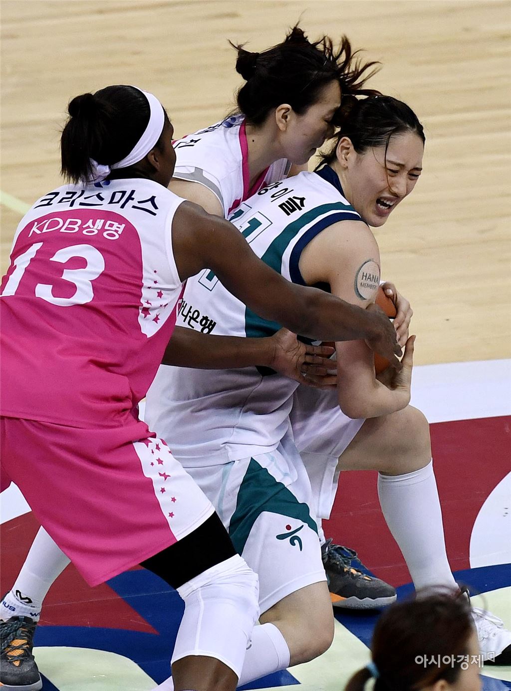 [부천=아시아경제 김현민 기자]여자프로농구 KEB하나은행과 KDB생명의 2016-2017 정규리그 경기가 25일 부천체육관에서 열렸다. 하나은행 강이슬이 상대와 공을 다투고 있다. 김현민 기자 kimhyun81@asiae.co.kr<ⓒ세계를 보는 창 경제를 보는 눈, 아시아경제(www.asiae.co.kr) 무단전재 배포금지>