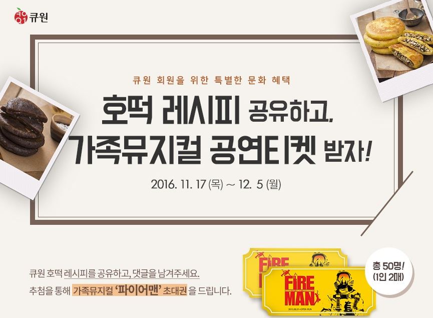 [아시아경제 이주현 기자]삼양사 큐원은 호떡 성수기인 겨울 시즌을 맞이해 오프라인과 온라인에서 시식행사 및 문화 이벤트를 실시한다고 29일 밝혔다. 상양사는 현재 70여 개 대형마트 매장에서 호떡 체험 행사를 전개하며 큐원 홈페이지 및 소셜네트워크서비스(SNS)에서 문화이벤트를 동시에 진행하고 있다. 문화이벤트는 홈페이지에 방문해 큐원 호떡 레시피를 지인에게 SNS로 공유하면, 추첨을 통해 50명에게 가족뮤지컬 초대권 2매를 제공한다. 행사는 12월5일까지 큐원 홈페이지에서 진행된다.한편 삼양사의 큐원 호떡믹스는 오븐 없이도 프라이팬만 있으면 조리할 수 있어 길거리 대표 간식인 호떡의 맛을 가정에서 쉽고 간편하게 즐길 수 있는 홈베이킹 프리믹스 제품이다. 삼양사는 찰호떡 믹스를 2005년 출시한 이래 고객 취향에 맞춰 제품군을 계속 확장하였고, 현재는 단호박호떡, 우리밀호떡, 흑미꿀호떡, 씨앗호떡, 명가호떡 등 6종의 호떡을 생산하고 있다.이주현 기자 jhjh13@asiae.co.kr<ⓒ세계를 보는 창 경제를 보는 눈, 아시아경제(www.asiae.co.kr) 무단전재 배포금지>