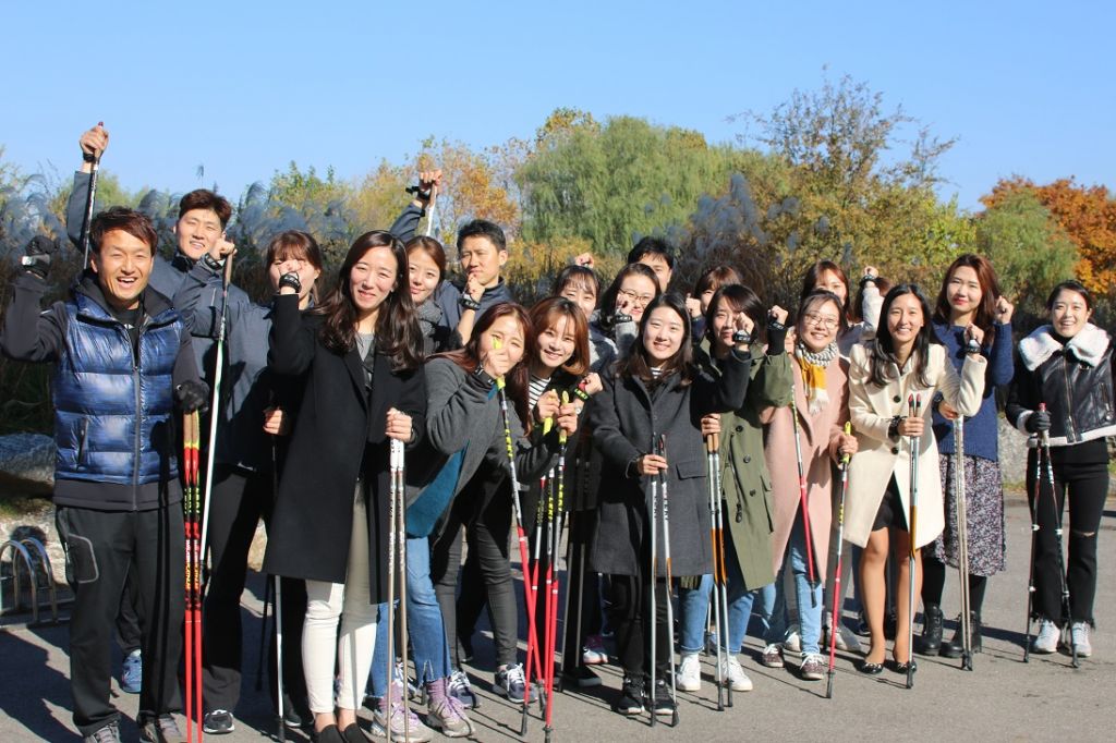 대웅제약 직원들이 서울 삼성동 인근 탄천과 잠실로 이어지는 한강 주변거리에서 '노르딕워킹'을 진행한 후 화이팅을 외치고 있다.