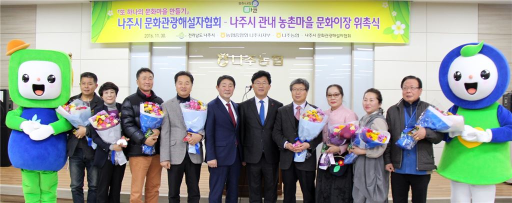 "나주시 문화관광해설자 8명~나주시 관내 마을 8개 문화이장 위촉식""전남 고향주부모임·농가주부모임 회원들, 농협행복나눔봉사단과 함께 김장담그기 행사"[아시아경제 노해섭 기자]농협중앙회 전남지역본부(본부장 강남경)은 30일 나주농협에서 나주시 문화관광 해설자협회(회장 최영)회원 8명과 나주시 관내 농협 8곳과 “또 하나의 마을 만들기~문화이장 위촉식”과 함께 나주농협 주차장에서“소외계층을 위한 김장나눔 행사”를 실시했다.