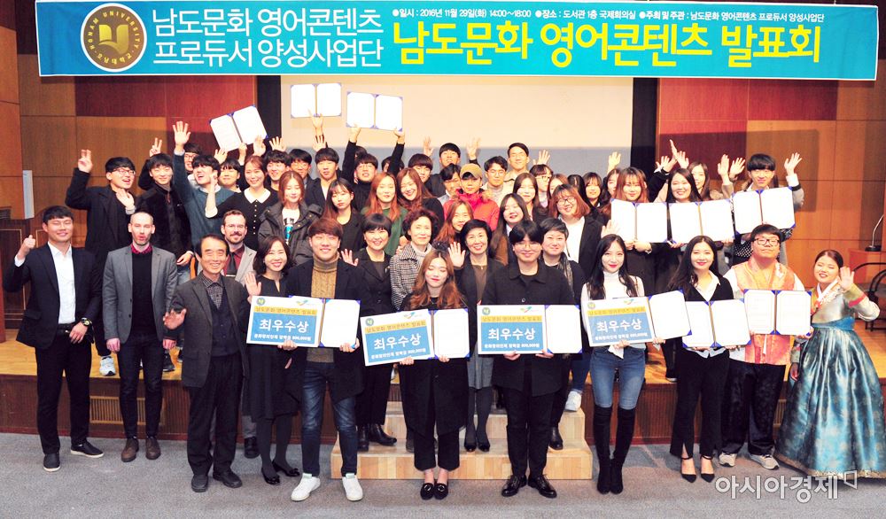 "최우수상, 장승의 토테미즘 주제로 한 ‘Jangseung’등 4개 작품 영예""우수상 6개 팀·장려상 7개 팀 수상…남도 유무형자원 글로벌 콘텐츠화" [아시아경제 노해섭 기자]호남대학교 남도문화영어콘텐츠프로듀서양성사업단(단장 정행)이 지난 29일 도서관 1층 국제회의실에서 개최한 '2016남도문화 영어콘텐츠발표회’에서 장승의 토테미즘을 주제로 한 Talkie Talkie팀(최석오·3학년 외 7명)의 ‘장승(Jangseung: A Korean Totem Pole)’등 4개 팀의 작품이 최우수상의 영예를 안았다.이날 발표회에는 영어영문학과 학생 17개 팀, 총 80여명이 참가해 강강술래와 화순 운주사 천불천탑, 왕인 박사의 생애 등 남도의 문화, 역사, 설화, 관광자원을 대학생의 시각으로 재구성해 동영상, 애니메이션, 연극, 인형극 등으로 선보여 큰 호응을 얻었다.최우수상에는 Talkie Talkie팀 외에 Moon's angels 팀(정세현·4학년 외 5명)의 ‘강강술래(Ganggangsulae)’, 비비디 바비디부팀(임준혁?학년 외 4명)의 ‘왕인의 시대(During the Age of Wang-In)’, 남도의 자랑 서편제 팀(이지훈·2학년 외 3명)의 ‘보성 서편제(Boseong Seopyeonjae)’도 수상자 명단에 이름을 올렸다. 우수상에는 Dr.Wang-In's children팀의 ‘일본에서 왕인박사의 생애와 업적(Dr.Wang-In's Life and Career in Japan)’을 포함한 HEBC 팀의 ‘남도 전통주(Namdo Traditional Liquor)’등 6개 팀의 작품이 수상했다.장려상에는 Pro Presenters팀의 ‘남도여행 가이드(Namdo Travel Guide)’를 비롯해 VS특공대 팀의 ‘남도에서 꼭 해야 할 일 : 순천, 여수편 (Must-dos in Namdo:Suncheon, Yeosu)’등 7개 팀의 작품이 수상의 영예를 안았다.노해섭 기자 nogary@<ⓒ세계를 보는 창 경제를 보는 눈, 아시아경제(www.asiae.co.kr) 무단전재 배포금지>