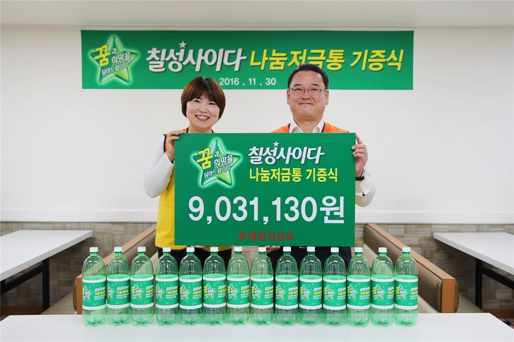 롯데칠성음료가 지난달 30일 서울 종로에 위치한 전국천사무료급식소를 찾아 ‘나눔저금통’을 통해 모은 성금을 기부하는 전달식을 가진 후 이동진 롯데칠성음료 경영지원부문장(오른쪽)과 김진옥 전국천사무료급식소 과장이 기념촬영을 하고 있다.