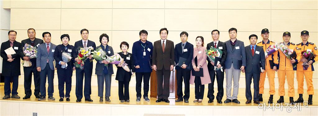 [아시아경제 노해섭 기자]이낙연 전남지사는 1일 오전 도청 왕인실에서 저출산 극복시책 평가 우수 시군, 마을 숲 콘테스트 우수 마을, 올 해의 영웅 소방관 등 도정 유공단체와 수상자에게 시상하고 기념촬영 했다.
