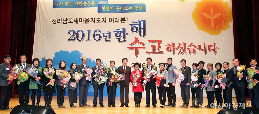 [아시아경제 노해섭 기자]이낙연 전남지사가 2016년 전라남도 새마을지도자대회에서 도정발전 기여 수상자들과 기념촬영하고 있다. 이날 행사는 임명규 도의회 의장, 권욱 도의회 부의장, 도의원, 황금영 전라남도 새마을회 회장과 회원 등 800여명이 참석해 1일 도청 김대중강당에서 열렸다.