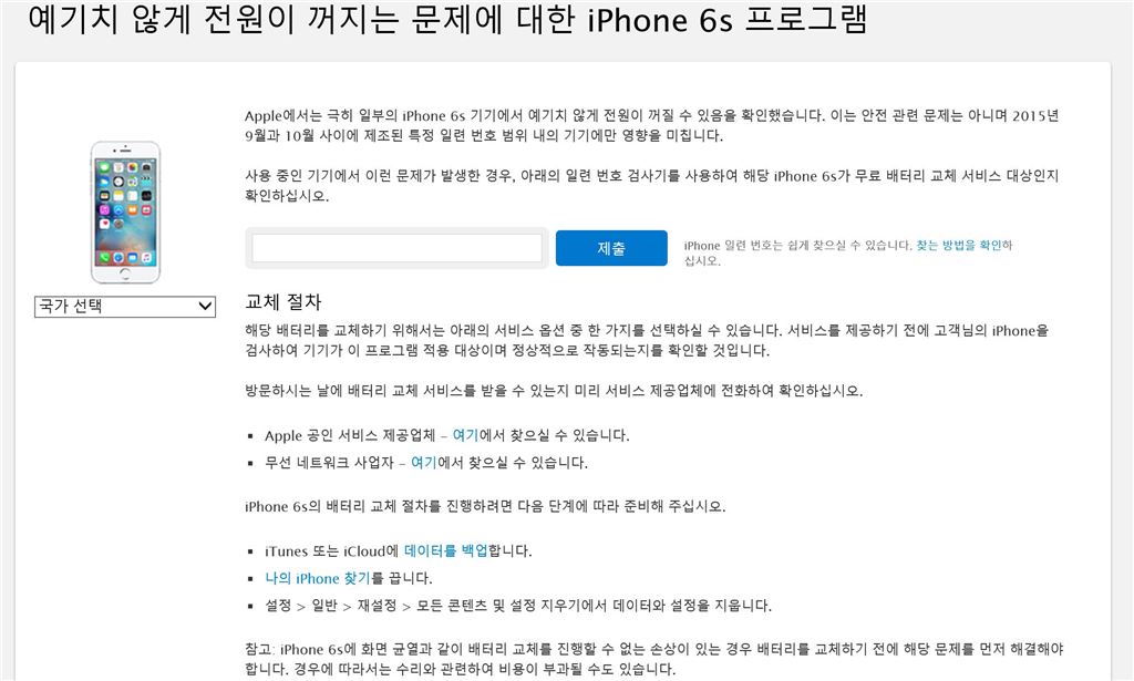 아이폰6S 배터리 무상 교체 프로그램 안내문(출처:애플홈페이지 캡처)